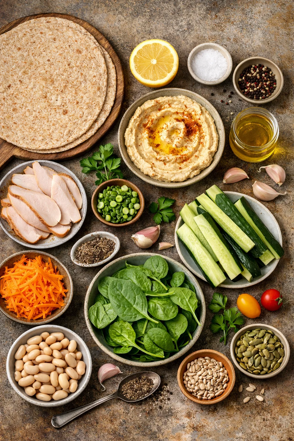 Spread hummus on a whole wheat tortilla, add turkey slices, shredded carrots, cucumber sticks, and a handful of spinach. Roll it tight. The hummus keeps it creamy without needing mayo, and the veggies give you that fresh bite.