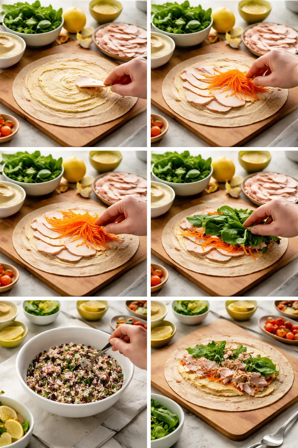 - Layer turkey slices, shredded carrots, cucumber sticks, and spinach.