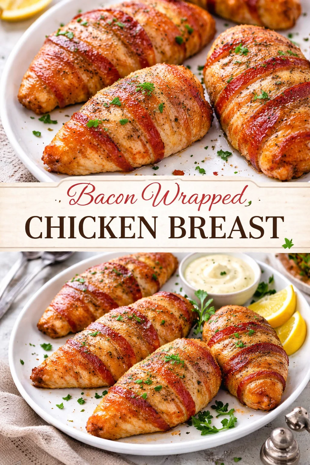Enjoy the comforting flavors of juicy chicken breasts wrapped in crispy, smoky bacon, perfect for family dinners or entertaining guests.
