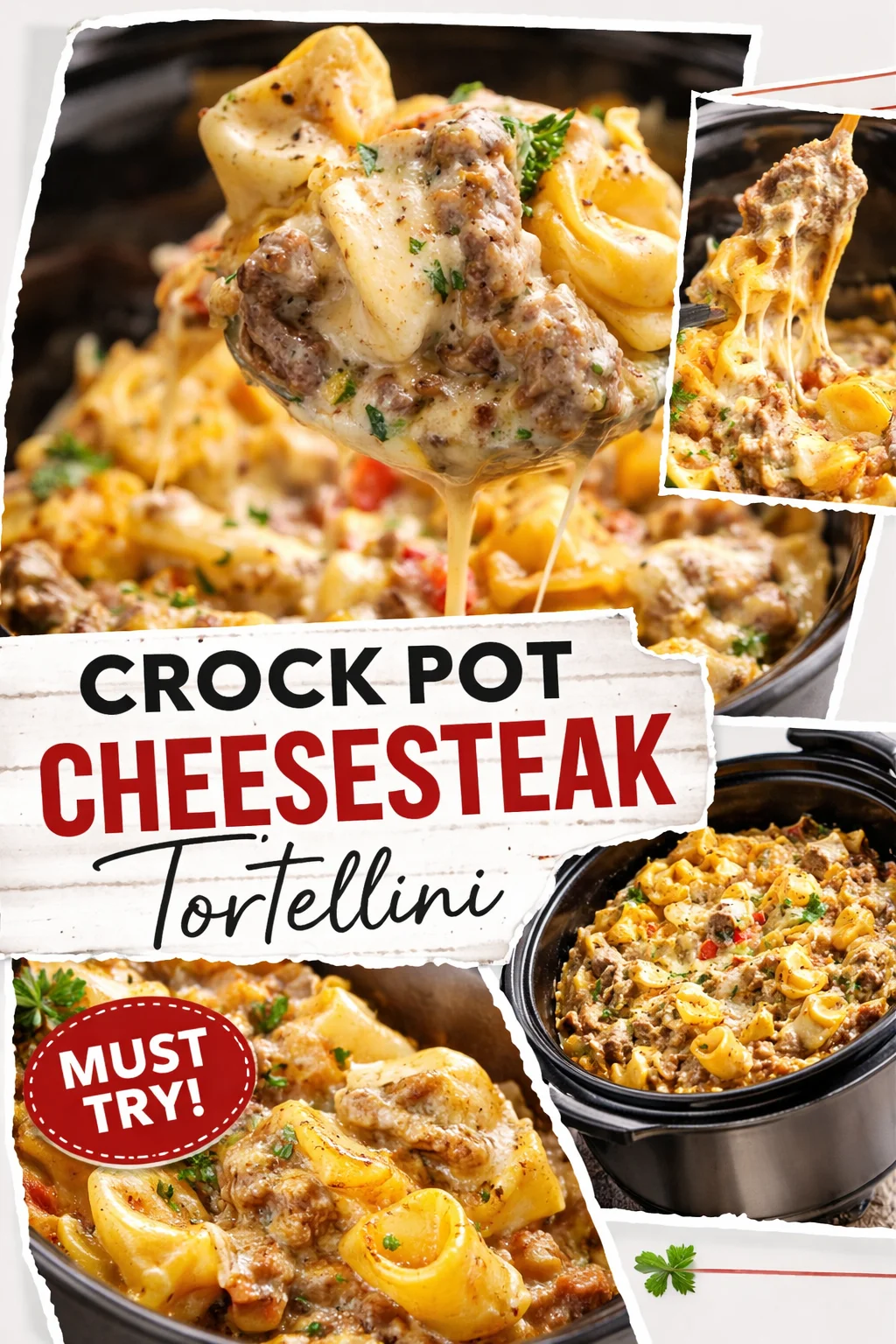 Imagine a chilly evening: bowls warmed by your palms, laughter around the table, and the creamy, beefy aroma rolling through the room — that’s the scene this Crock Pot Cheesesteak Tortellini creates. For a contrasting weeknight comfort idea, keep a pot of creamy crockpot white chicken chili in rotation alongside this recipe for variety.