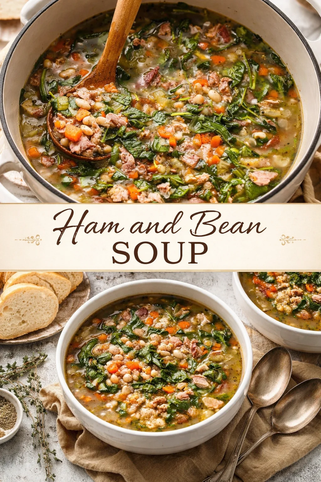 Picture a big, steaming pot on a cold evening: bowls of Ham And Bean Soup Recipe tucked into hands, rolls steaming, butter melting. Serve with: