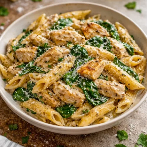 Combine Ingredients: Once the chicken is cooked, stir in 2 cups of fresh spinach. Cook until wilted, then add the drained pasta to the skillet.