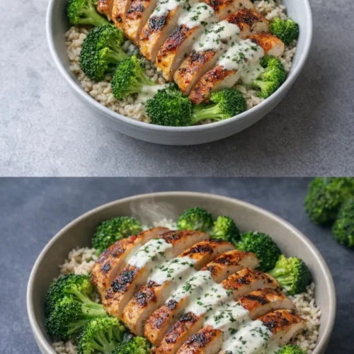 • Assemble the bowls: Slice the grilled chicken, layer it over broccoli, and drizzle with creamy garlic sauce.