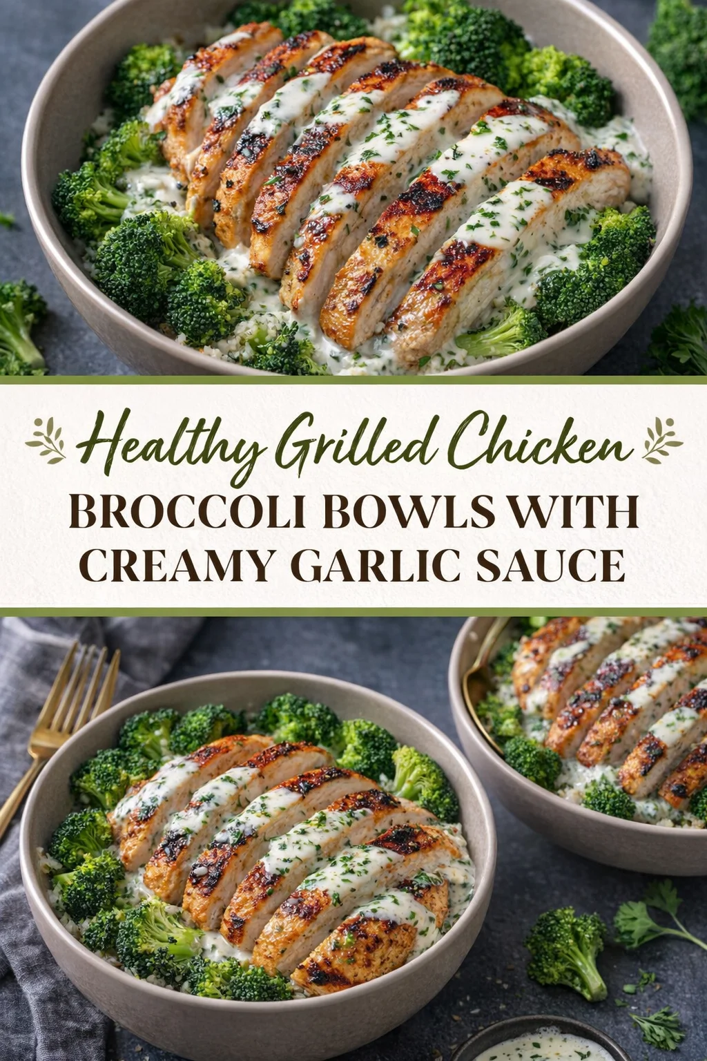 A quick and easy recipe for healthy grilled chicken and broccoli bowls topped with a creamy garlic sauce, perfect for busy weeknights or family gatherings.