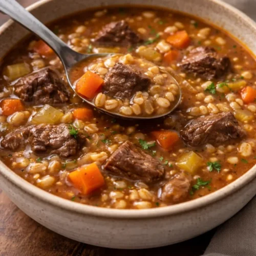 This is not one of those “30-minute” meals, but the extra simmering time is rewarding — the barley swells, the beef becomes fork-tender, and flavors meld into something greater than the sum of its parts.