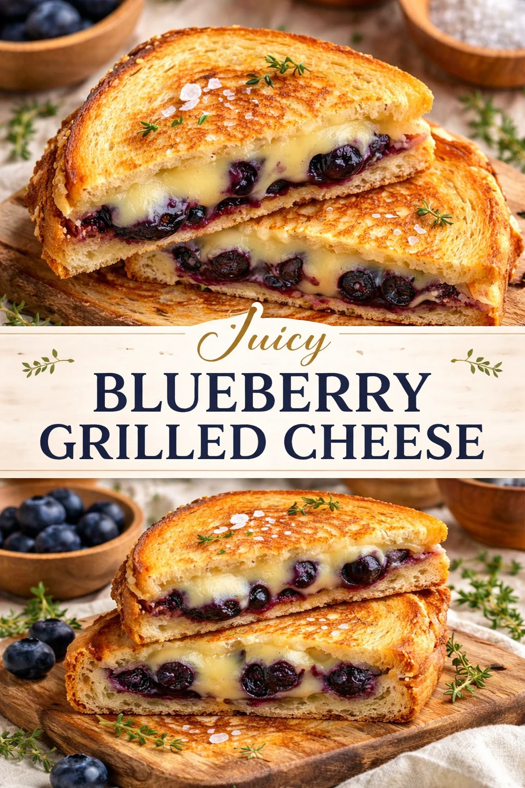 A delightful twist on a classic grilled cheese sandwich featuring juicy blueberries and melty cheese, perfect for a comforting meal.