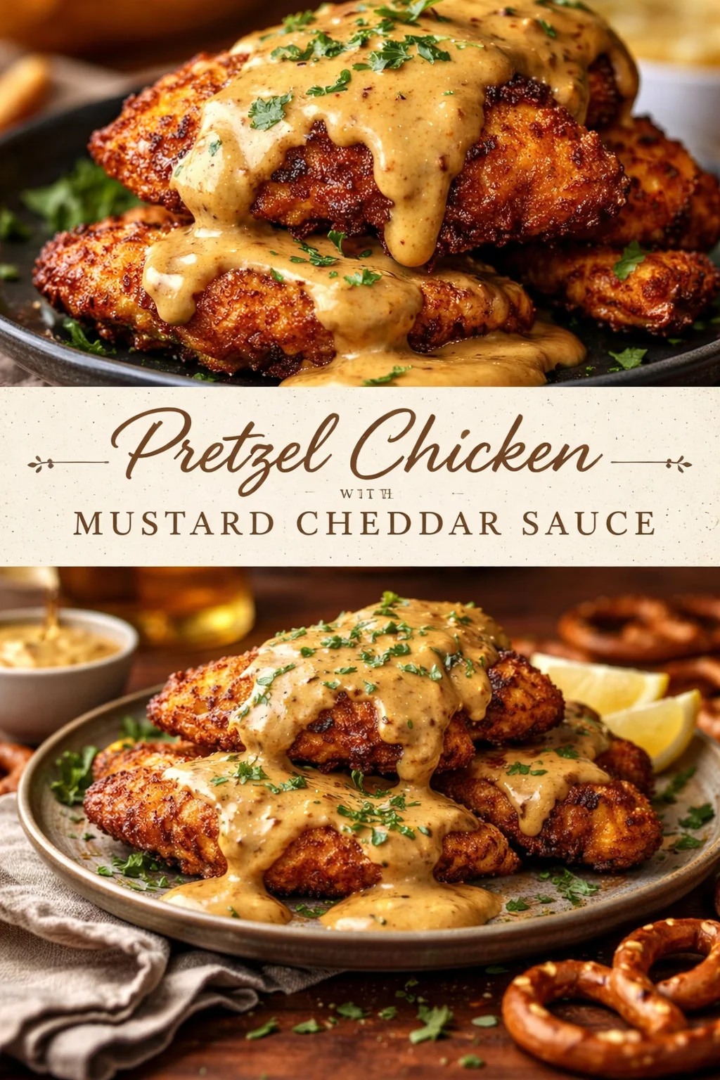 Serve this Pretzel Chicken with Mustard Cheddar Sauce alongside warm roasted potatoes, a crisp green apple and arugula salad, or buttered noodles. For drinks, an easy lager or a bright Chardonnay complements the salty pretzel crust and the creamy, tangy sauce. Picture a cozy table, steaming plates, and the little ritual of wiping sauce onto soft bread — this is the sort of comforting food that becomes a memory.