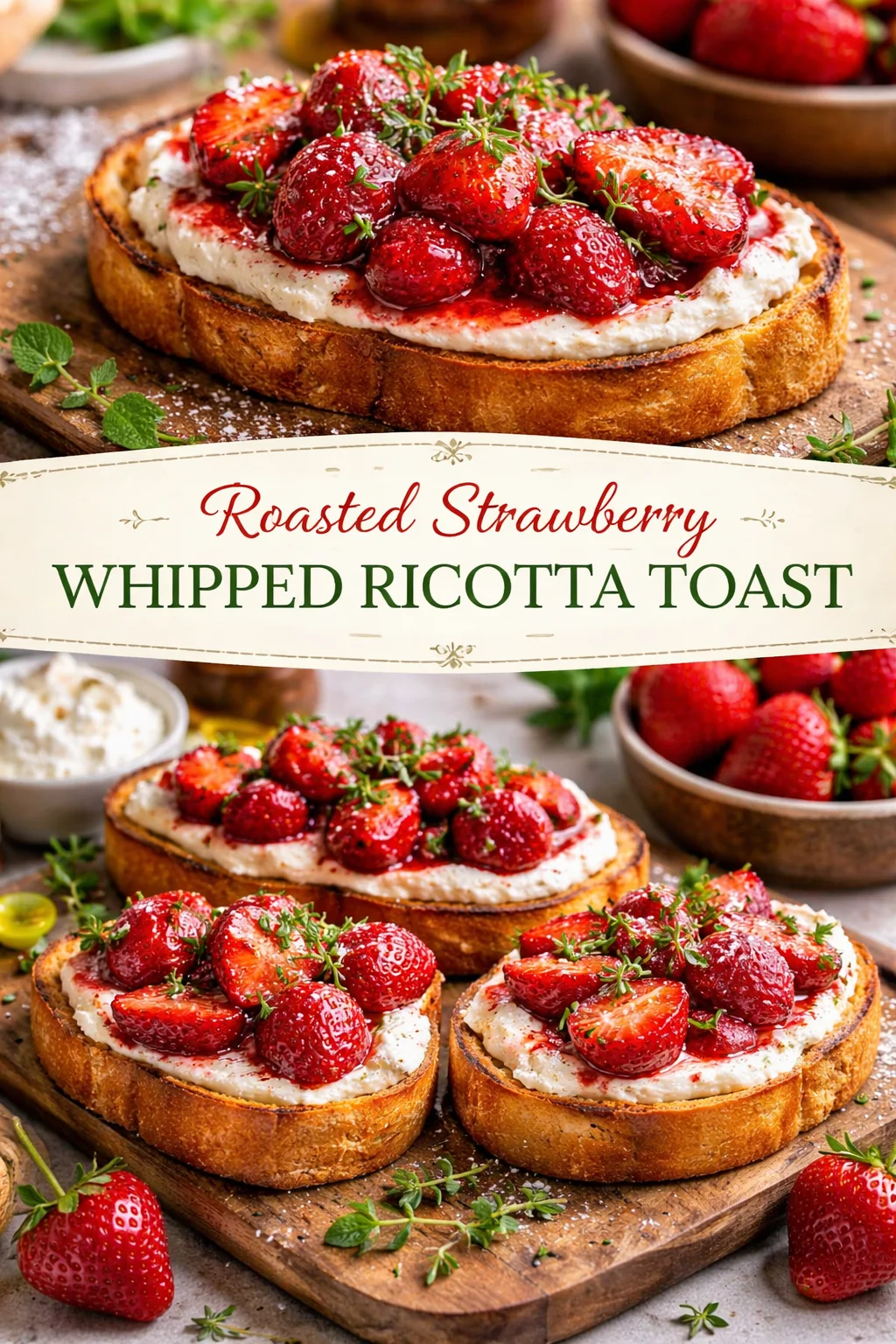 Serve Roasted Strawberry Whipped Ricotta Toast warm with a pot of chamomile tea for a calm morning, or on a platter as part of a brunch spread alongside citrusy salads and crusty bread. For an evening twist, present it as a light dessert after a festive meal — the tart-sweet berries and creamy ricotta feel celebratory without being heavy. Picture a sunny picnic blanket, laughter, and a stack of these toasts passed around: simple, beautiful, shared.