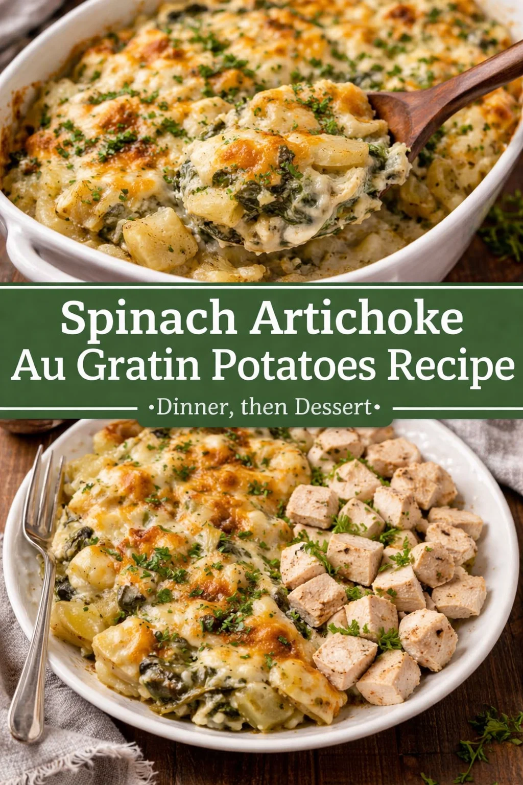 This Spinach Artichoke Au Gratin Potatoes Recipe – Dinner, then Dessert checks all the boxes for those magical family meals. Here’s why you’ll fall head over heels: